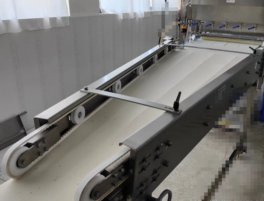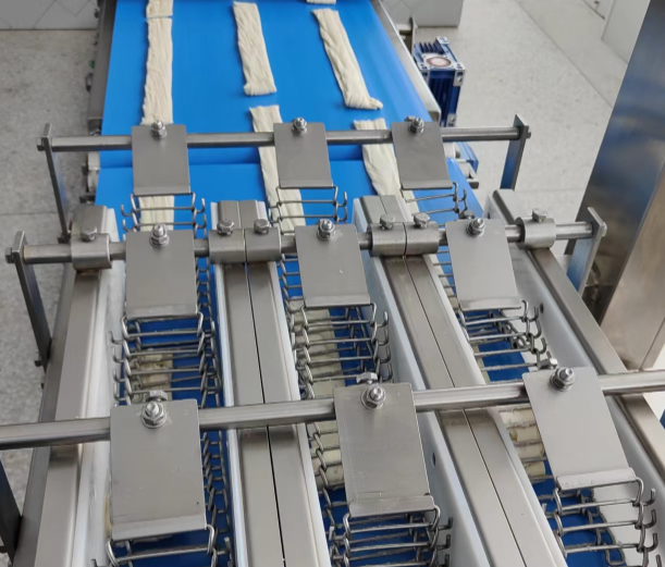 Dough are now vertically cut here and transfer to the next part of line that is rolling.